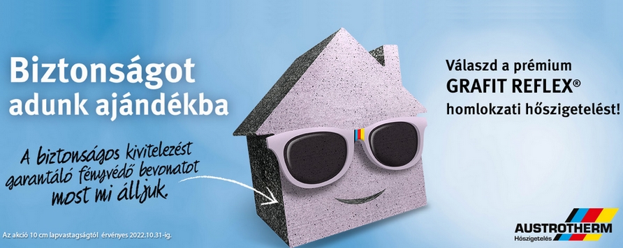 A GRAFIT REFLEX® világos festékrétege nagyobb mértékben veri vissza a beeső napsugárzást, így káros felmelegedéssel nem kell számolni, a felület hőmérséklete 20-40 °C-al is alacsonyabb lehet a kezeletlen táblákhoz képest. Ez biztonságossá teszi a kivitelezést, és ezt a biztonságot most az Austrotherm ajándékba adja. A 10 cm-es, vagy annál vastagabb GRAFIT REFLEX® táblákra a fényvédő bevonatot október 31-ig az Austrotherm állja.