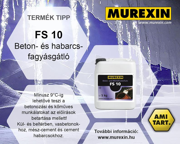 A Murexin FS 10 beton és habarcs fagyásgátló adalékszerrel, a tél beálltával is lehet építőipari munkálatokat elvégezni megfelelő körültekintéssel. A Murexin FS 10 egy kloridmentes, folyékony beton és habarcs fagyásgátló adalékszer. Adagolásával a beton és a habarcs hidratációja és szilárdulása felgyorsul és így a fagyásállósághoz szükséges 5 N/mm² nyomószilárdsági érték hamarabb elérhető, tehát az anyag minőségi károsodás nélkül szilárdul.