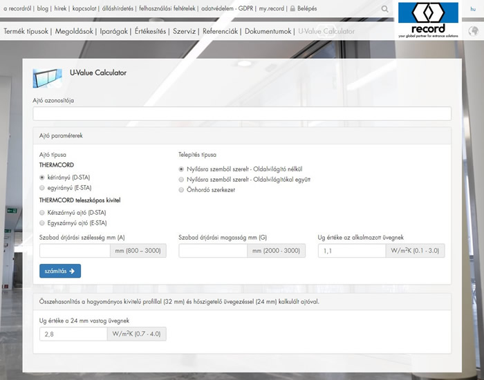 A szerkezeti hőátbocsátási tényezők mérése immár egyszerűen és kényelmesen elvégezhető ezzel az új, online felületen elérhető kalkulátorral. A mérésből kiderül, hogy a speciális fejlesztésű record THERMCORD hőszigetelő automata ajtó mennyivel kevesebb hőt enged át, mint egy hagyományos automata ajtó. A fokozott hőszigetelésért kifejlesztett automata ajtó termékcsalád a legjobb választás, ha hőszigetelő bejáratról van szó, hiszen az üvegvastagságon kívül a profilrendszer is egyedi kialakítású.
