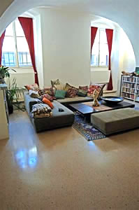 Vízszigetelt vagy párazáró réteggel alulról védett cementkötésű aljzat. | Közepes forgalmat elvisel, fokozottan vegyszerálló, csúszásmentes, többrétegű dekorpadló. | Vendéglátóipar, szállodák, bemutatótermek, kiállítóhelyek, kereskedelmi és bevásárló központok, üzlethelységek, irodák. |